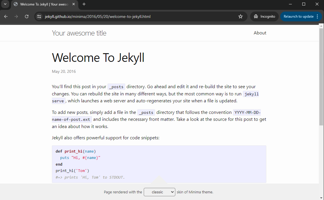 The default Primer GitHub Pages theme is nice... but it lacks a homepage index of your most recent blog posts. π’ IMO the best path forward is to switch to another default theme: the builtin default Jekyll Minima theme.